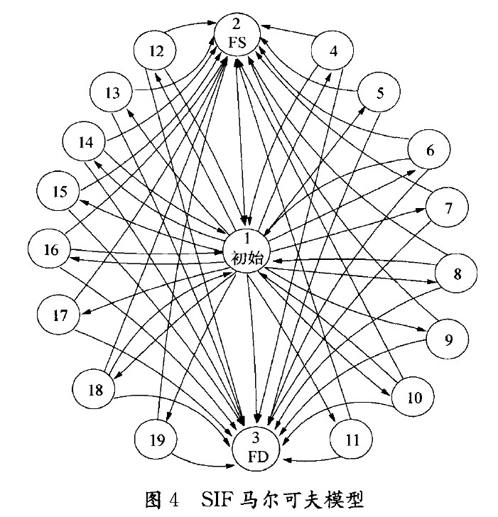 馬爾可夫模型具有動態(tài)分析失效概率的能力,上述SIF馬爾可夫模型如圖4所示,其中狀態(tài)1為初始完好狀態(tài);狀態(tài)2為安全失效(誤停車)狀態(tài);狀態(tài)3為危險失效狀態(tài)(對安全要求的動作沒有響應);其余狀態(tài)4~19為存在一路檢測傳感器或執(zhí)行機構失效,且SIF還能執(zhí)行相應安全功能的中間狀態(tài)。處于中間狀態(tài)時,若出現(xiàn)進一步的故障,將使SIF系統(tǒng)進入安全失效或危險失效狀態(tài)。由于失效率都很小,為簡化運算,建模時不考慮級聯(lián)失效(如一路溫度傳感器失效后又出現(xiàn)一路壓力傳感器失效,但SIF還能執(zhí)行其要求的功能的情況)對計算精度的影響。
