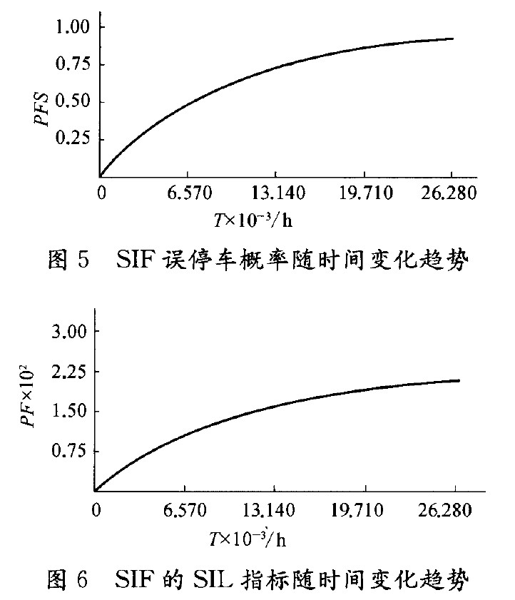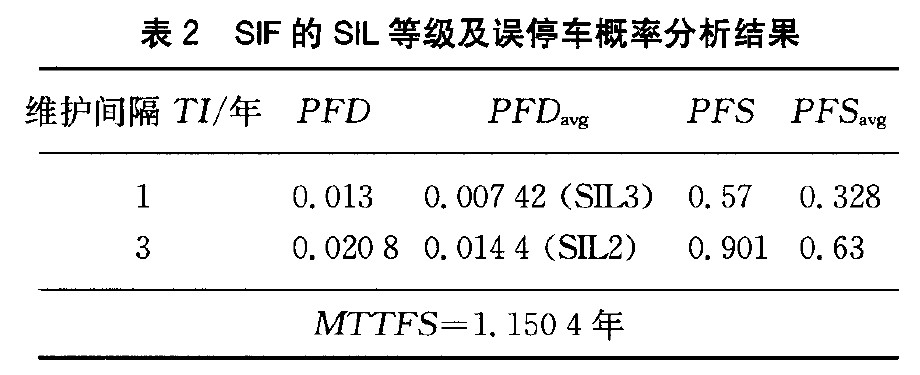 由分析可見,此SIF的MTTFS為1.15 a。雖然該SIF不論在維護檢修時間間隔為1 a還是3 a時,其SIL等級都能滿足設計要求(SIL2),但3 a的檢修時間間隔是不能接受的,因其過大的誤停車概率將引起SIS的頻繁誤停車,造成巨大的經濟損失,而使系統(tǒng)無法實際投用。因此,對于一般企業(yè)規(guī)劃的3 a大修時間問隔,必須重新分析考核,在滿足SIF的SIL等級要求的前提下,達到相應的MTTFS和PFS 指標要求,才能有效發(fā)揮SIS在企業(yè)安全生產中的安全防護作用。