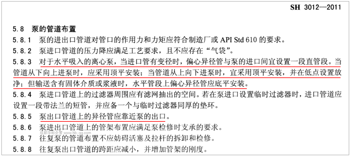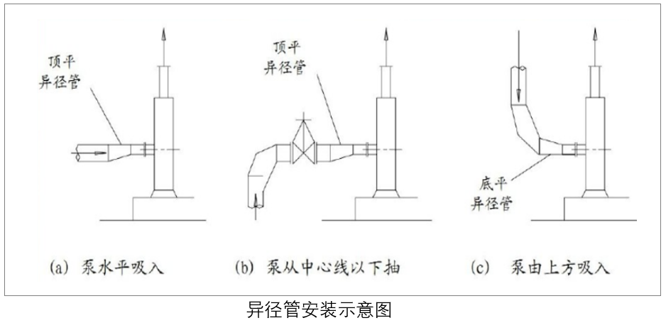 5.8.3 對于水平吸入的離心泵,當(dāng)進口管有變徑時,偏心異徑管與泵的進口間宜設(shè)置一段直管段。當(dāng)管道從下向上進泵時,應(yīng)采用頂平安裝;當(dāng)管道從上向下進泵時,宜采用頂平安裝,并在低點設(shè)置放凈;但輸送含有固體介質(zhì)或漿液時,水平管段上偏心異徑管應(yīng)底平安裝。
