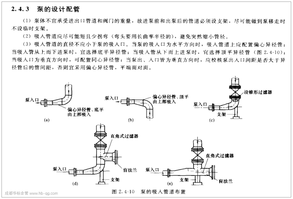 2.3 但是,輸送含有固體顆粒的液體時,且泵的吸入速度又低于其沉降速度,則固體顆粒會沉降到底部,此時要求偏心大小頭底平,用排氣閥排除大小頭處積聚的氣體。≤DN50者可用同心大小頭(變徑管);當(dāng)泵入口管系統(tǒng)中有U形部分時,應(yīng)在其高點設(shè)排氣口,一般情況不得有袋形。