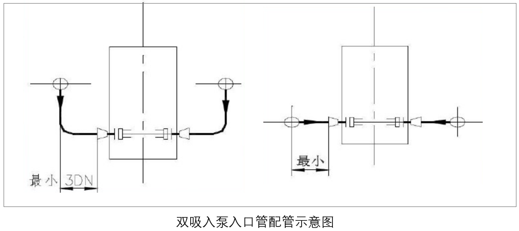 2.1離心泵的配管。泵的吸入管道: 泵吸入管道在滿足熱應(yīng)力的前提下盡量短且少拐彎, 在任何情況下入口管道不允許有袋形。雙吸入泵的吸入口要設(shè)一段至少有 3 倍管徑長的直管段, 對大型泵則直管段長應(yīng)為 5~7 倍管徑。當(dāng)雙吸入泵的配管為上吸入時, 不必考慮本條第二款所要求的直管段。垂直管道可以通過彎頭和異徑管與吸入管口直接相連, 要求盡量短。
