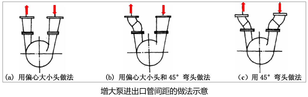 2.4當(dāng)泵的吸入口和排出口在同一垂直面上時, 為便于安裝閥門, 進出口可用偏心異徑管或兩個45° 彎頭增大進出口管間距,如圖:
