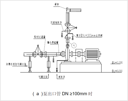 2.6 泵出口管道一般應(yīng)配異徑管, 當(dāng)排出口在上部時, 應(yīng)配同心異徑管, 當(dāng)排出口在側(cè)面時, 一般取偏心異徑管, 斜邊在上面(底平)。