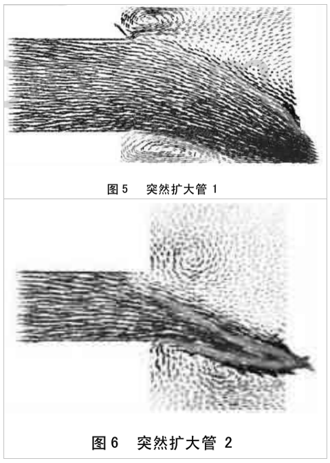 圖5、圖6 分別表示不同輸入管徑,在相同壓力、相同流速下的變徑接頭處流場變化情況。從上兩圖可以看出,二者在變徑處都形成了渦流,但通徑變化大的形成的渦流范圍比變化小的大。通突然縮小通徑相比,突然擴大管的流體基本上未產(chǎn)生管道徑向方向上的力。這種管道連接方式最大的缺陷就是管徑擴大處存有大量的空氣,需要經(jīng)過長時間、多次的排氣才能將內(nèi)部空氣排除。
