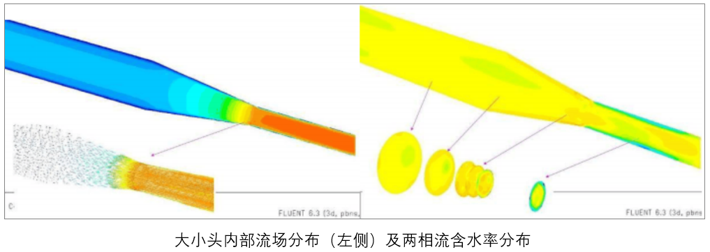 中國特檢院曾對中石油某油田采氣廠的典型管件進行了流場分析及內(nèi)腐蝕 /沖蝕模擬,以大小頭為例,數(shù)值模擬結(jié)果表明大小頭內(nèi)部的流速從靠近小頭部位開始增大, 最大流速出現(xiàn)在距離大小頭約 2 倍大小頭直徑的距離,而速度梯度最大的位置出現(xiàn)在大小頭靠近連接焊縫的位置。 通過對含水兩相流條件下大小頭局部區(qū)域的含水率分析表明,含水天然氣在大小頭靠近小頭區(qū)域的含水率最高,具體如圖 所示。