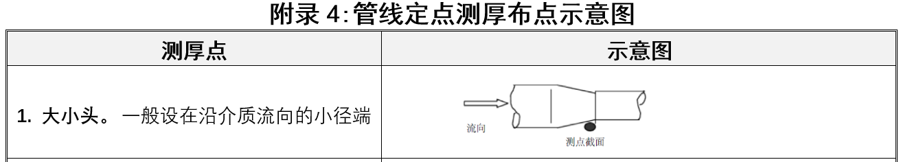 這一分析結(jié)論大小頭實際生產(chǎn)中的腐蝕穿孔形式相吻合,確實符合“管徑變小,壓力增大,流速增大”這一規(guī)則。在需要定期測壁厚時,宜測沿介質(zhì)流向的小徑端,如圖: