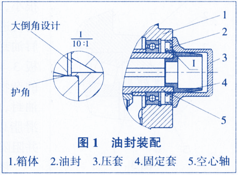 由油封裝配工藝不當引起的漏油主要是:裝配時油封唇口破損、油封歪斜和運行時唇口干摩擦(提示:檢修時安裝油封也應注意)。在裝配油封過程中,若采用簡易的工裝,甚至不用工裝直接將油封裝入,油封唇口很容易受到損傷,在日后運轉中損傷將逐漸擴展,造成漏油;同時,油封若安裝歪斜,油封唇口將無法正常丁作,從而造成潤滑油泄漏。我公司采用圖1方式裝配油封。