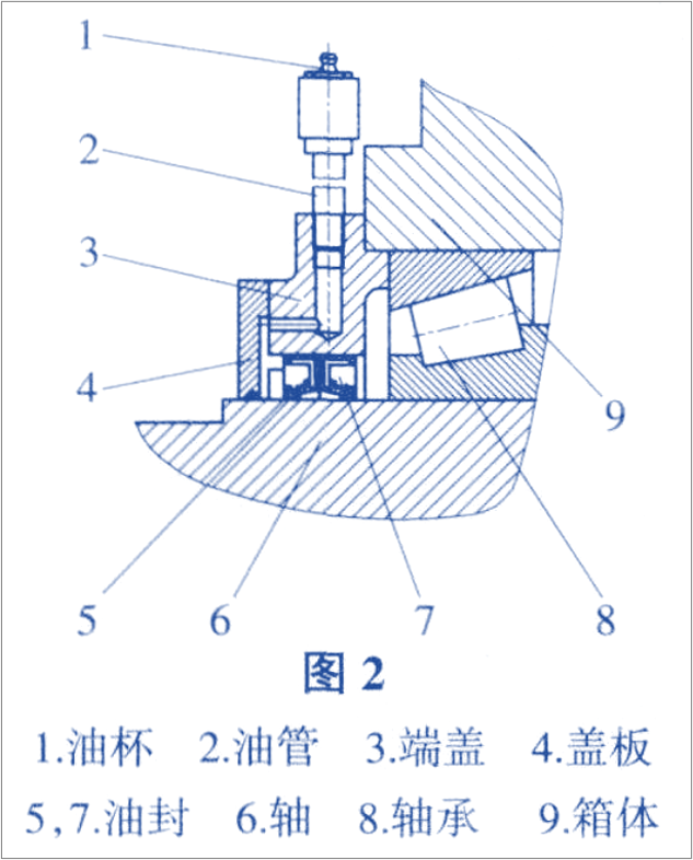 圖2中,單唇油封5和7面對面安裝。蓋板4內徑與軸6外徑之間保持小間隙,以阻止大顆粒雜物的進入。定期從油杯1處注入的油脂可以潤滑油封5的主唇口,同時阻止雜物從蓋板4內孔與軸6之間進入。