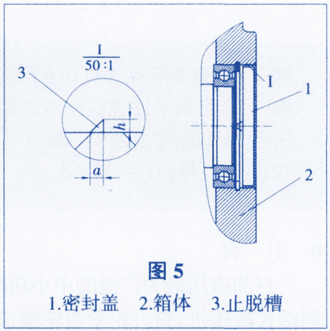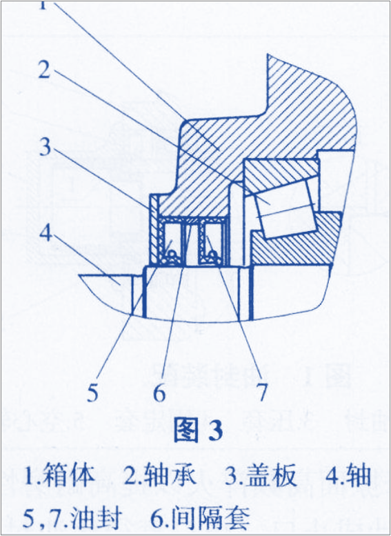 圖3中,蓋板3內孔與軸4之間的間隙很小,以阻止大顆粒雜物的進入。油封5為雙唇油封,用于阻止從蓋板3與軸4之間進入的雜物,油封7為單唇油封,兩油封間注入潤滑脂以潤滑油封唇口并阻隔雜物。
