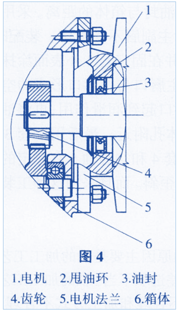 圖4為高速軸密封結構,齒輪4轉速在1500r/min以上,齒輪4甩出的潤滑油溫度高并夾雜異物,以較大的壓力打擊在油封3的唇口,對油封唇口甚至軸上的油封檔損害很大。安裝甩油環2后,齒輪4甩}n的潤滑油不能直接打擊油封3的唇口,消除了對油封唇口的損害。使用甩油環后,由于高速軸油封的失效不再出現,印證了甩油環2對油封3的保護作用。