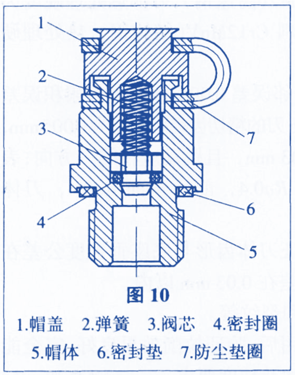 圖7是一種常通式通氣器的代表,通氣孔有朝下的,也有在側邊的,還有迷宮式的。因為是常通式的,所以不符合四大系列減速機對通氣器的要求;圖8的通氣器在運輸時用閥芯堵塞,在使用時將閥芯拔出,成為通式通氣器,運行時水汽、粉塵等容易進入減速機;圖9的通氣器在使用時,減速機內部需要一定的壓力才能開啟,這類通氣器基本符合要求,但在運輸時密封不可靠。我公司通過多年的研究,開發出一款通氣器,如圖10。