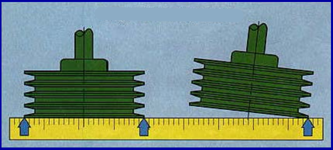 下圖一的所產生的不平行,導致的結果是皮帶或帶輪被磨損,及單根皮帶的性能下降。其他相關的問題野會發生,如皮帶和線繩的負載不均勻,對于聯組皮帶,也會導致單根皮帶負載不均而提前失效的風險。圖1