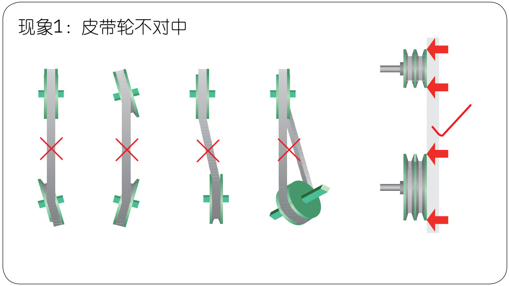 • 安裝過程中要保證帶輪的對中度和平行度, 帶輪不對中會導致皮帶的受力不均, 噪音, 過度磨損。