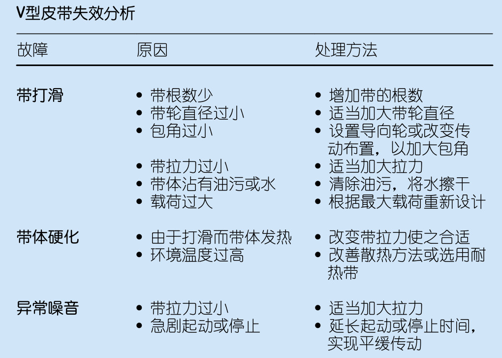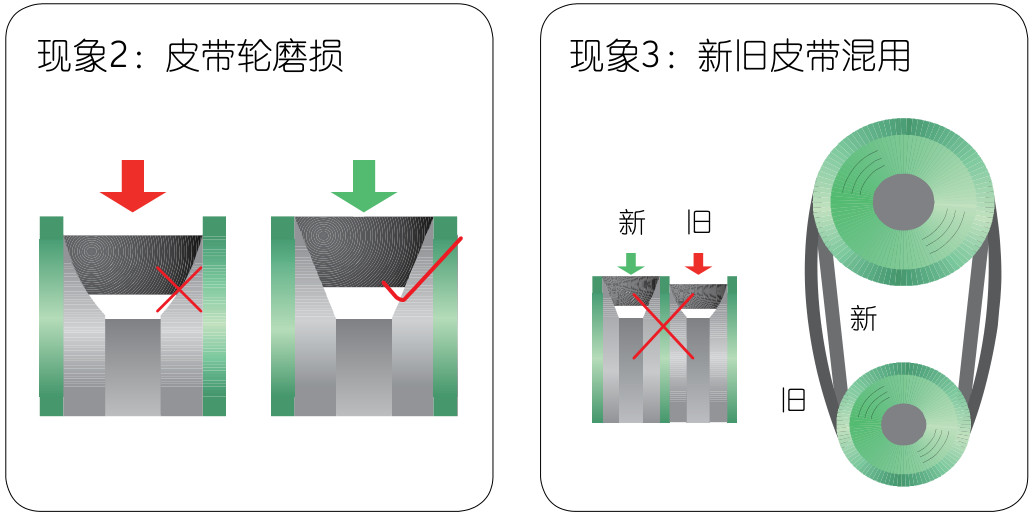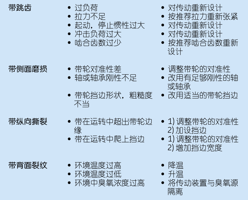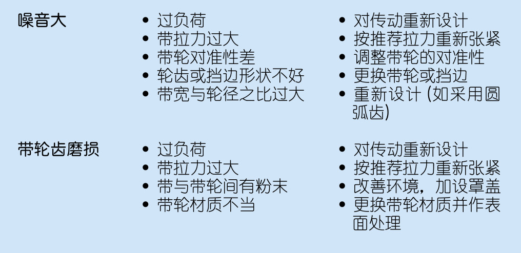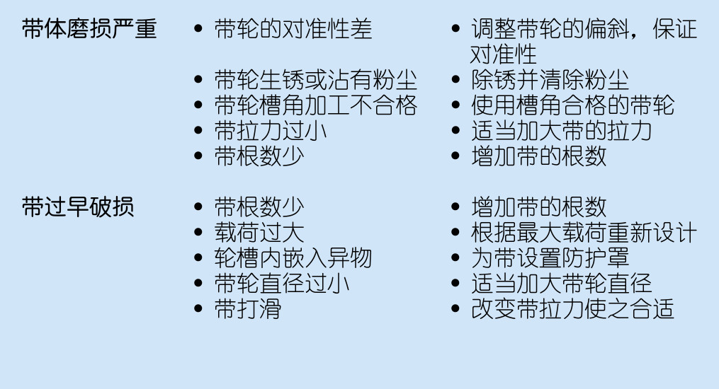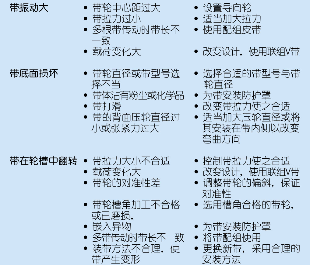 • 保證合適的安裝張力, 張力不足會導致V型帶打滑, 同步帶跳齒, 傳遞效率下降; 張力過高會導致皮帶拉長, 高溫, 連接軸以及軸承均容易受到過度應力