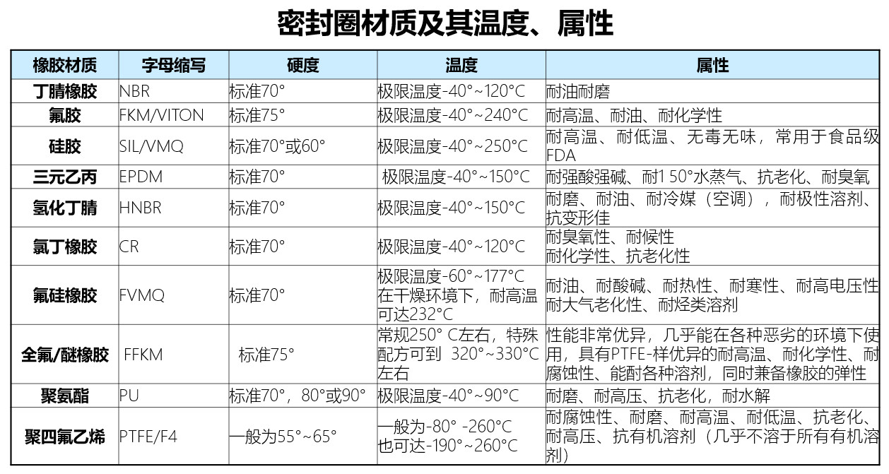 (2)密封圈的材質要與工作液體相容(參考下圖),密封圈的工作溫度要在密封材料容許的范圍內,用過的密封圈不宜再次使用。