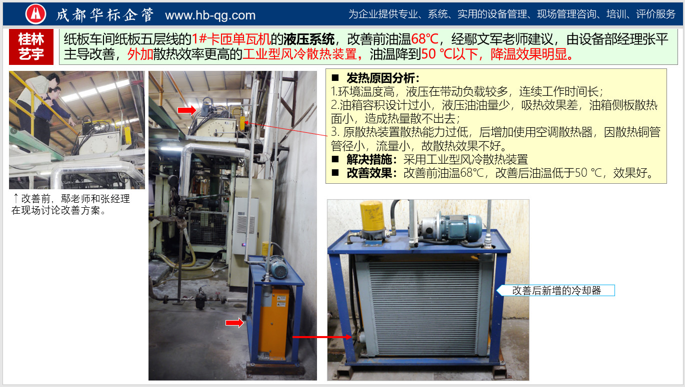 c)根據需要,配置更大功率的冷卻器。實例:桂林藝宇公司紙板車間五層線1#卡匝單瓦機的液壓系統,因使用環境溫度高,系統油溫過熱經常報警,成都華標企管鄢文軍老師和藝宇公司設備經理張平一起在現場診斷分析后,確定更換了更大功率的工業風冷器,改善后控溫效果良好(低于50℃)。