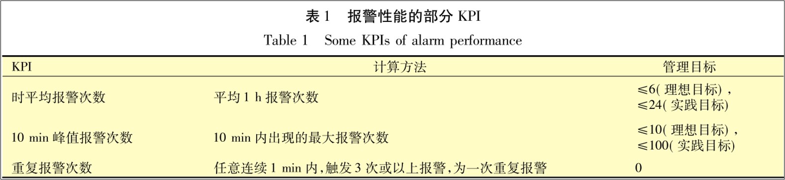 報警性能指標可以實現裝置報警性能的量化,為報警優化提供整改方向。報警性能的部分關鍵績效指標(KPI)見表1。