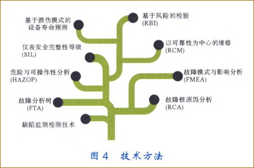 利用現(xiàn)有的設(shè)備信息化系統(tǒng)深化技術(shù)方法的應(yīng)用(圖4)。各專業(yè)全面推廣故障根原因分析方法,對(duì)關(guān)鍵設(shè)備故障和頻發(fā)性故障進(jìn)行根原因分析,有效管控設(shè)備故障率,避免重復(fù)故障的發(fā)生。靜設(shè)備專業(yè)對(duì)主要生產(chǎn)裝置開展RBI技術(shù)應(yīng)用,建立承壓設(shè)備風(fēng)險(xiǎn)管理模式:推廣基于損傷模式的設(shè)備壽命預(yù)測(cè)、在線狀態(tài)監(jiān)測(cè)等技術(shù)方法。動(dòng)設(shè)備專業(yè)在主要生產(chǎn)裝置實(shí)施以可靠性為中心的維修(RCM),逐步建立設(shè)備基于可靠性的維護(hù)保障模式。儀控專業(yè)通過評(píng)估企業(yè)安全儀表系統(tǒng)安全完整性等級(jí)(SIL)和應(yīng)用危害與可操作性分析(HAZOP)方法,形成規(guī)范性工作機(jī)制。電氣專業(yè)深化開展電氣設(shè)備平穩(wěn)運(yùn)行攻關(guān),穩(wěn)步推進(jìn)無人值守變電所建設(shè)。
