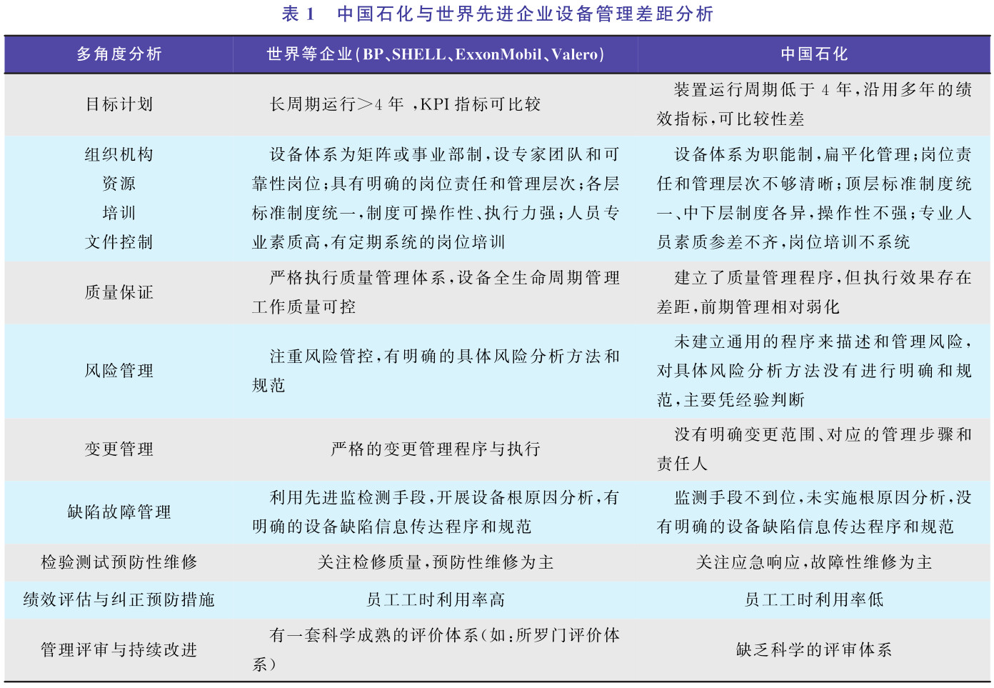 表1 中國石化與世界先進企業設備管理差距分析
