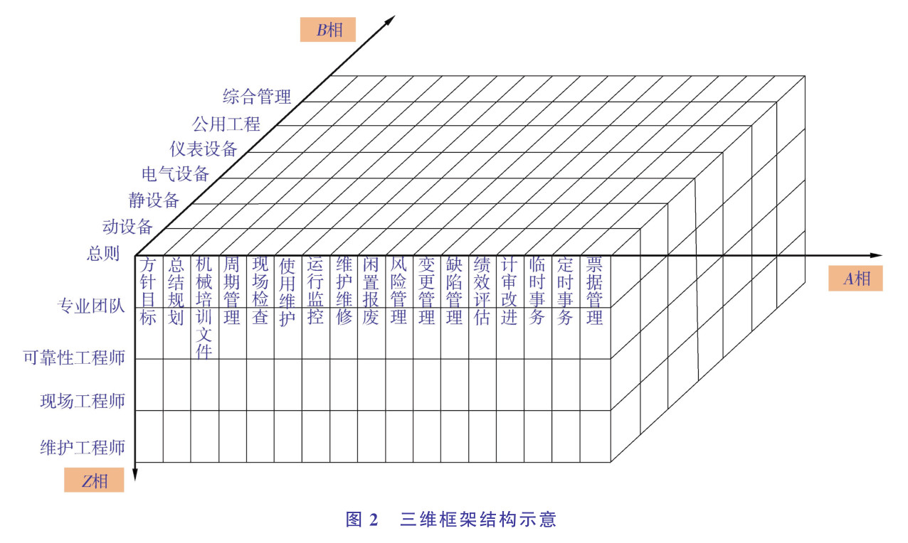 三維架構由管理軸(A相)、技術軸(B相)、人員軸(Z相)組成。管理軸,對設備管理流程進行梳理,形成由制度、流程、表單構成的標準化流程,科學合理和標準化是其兩大特點。技術軸,分專業確定技術手段,開展技術攻關。開展缺陷監測檢測、故障樹分析(FTA)、故障根原因分析(RCA)、危險與可操作性分析(HAZOP)、故障模式與影響分析(FMEA)、儀表安全完整性等級(SIL)、以可靠性為中心的維修(RCM)、基于風險的檢驗(RBI)和基于損傷模式的設備壽命預測等工作。人員軸,開展組織架構改革,建立“設備支持中心”,增強可靠性管理能力,打造“專業管理+區域服務”設備管理架構,開展設備技術崗位資格培訓認證,組建5大團隊和4支工程師隊伍。形成“機動處管總、專業團隊主建、區域團隊主戰”的態勢,在區域內形成技術中心、管理中心、成本中心,使管理重心下移,做到分工責任明確。