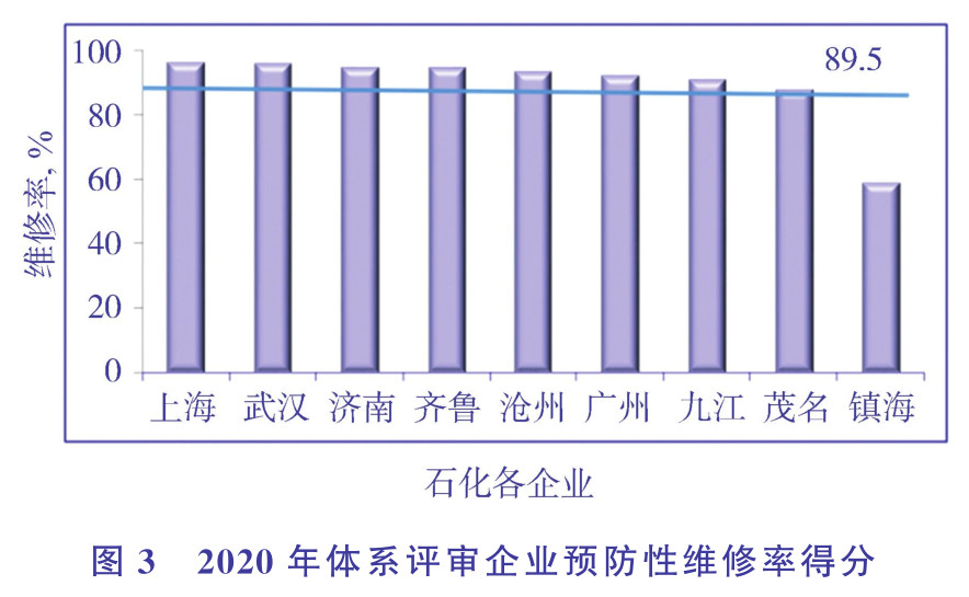 設備完整性管理體系試點成功后,煉油事業部于2018年7月啟動第一批7家企業推廣工作。推廣工作分現狀評估、整體策劃、體系文件編寫和審查、體系實施以及管理體系評審驗收5個階段進行。計劃利用2年半時間,即到2020年底基本完成體系建設。通過體系建立,形成一套基于風險的、以預防為主的、傳承歷史的、標準的管理模式,實現不同人做同一件事遵循同一個流程、執行同一個標準、得到同一個結果的目的。2020年體系評審企業預防性維修率得分見圖3。