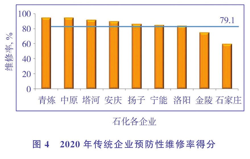 2019~2020年開展了以設備完整性管理要素復核模式的設備大檢查。第一次從體系的角度發現問題,力求以檢查推動完整性建設。推進發現問題從體系上找原因、從以治標為主向注重治本轉變。2020年傳統企業預防性維修率得分見圖4