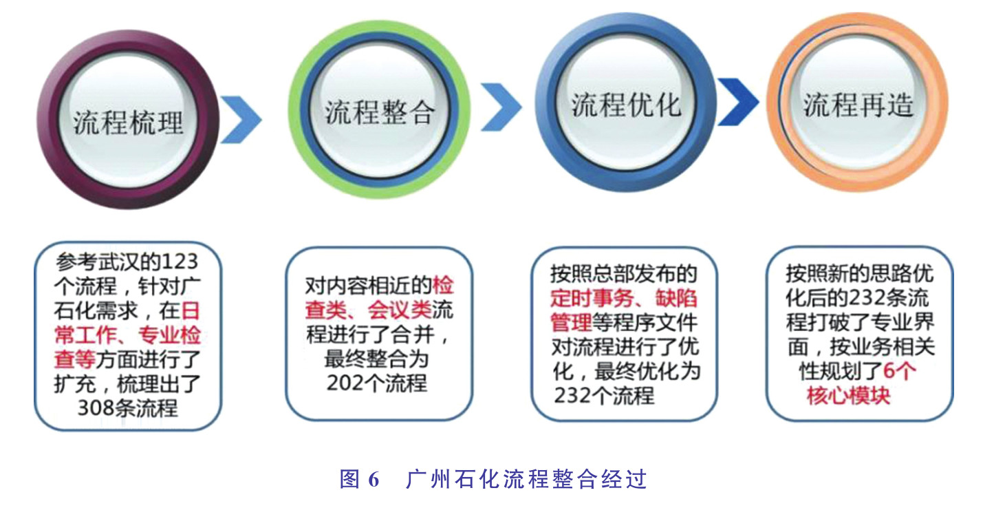設備完整性建設企業按照體系管理思維,梳理制度整合為體系文件,形成標準流程和標準表單。廣州石化在流程梳理過程中進行優化,形成計劃費用、缺陷管理、預防性維護、預防性維修、事項跟蹤和標準審批等六大核心流程群組,從308個流程優化簡化為232個。利用缺陷管理流程直接形成壓力容器月度檢驗報告,每月可減少工作量90個工日。廣州石化流程整合經過見圖6。
