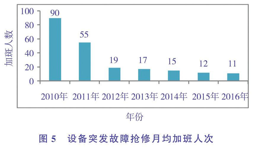 承包商的加班搶修次數降低,績效顯著提高。設備突發故障搶修月均加班人次由2010年的90人/月降低至2016年的11人/月。