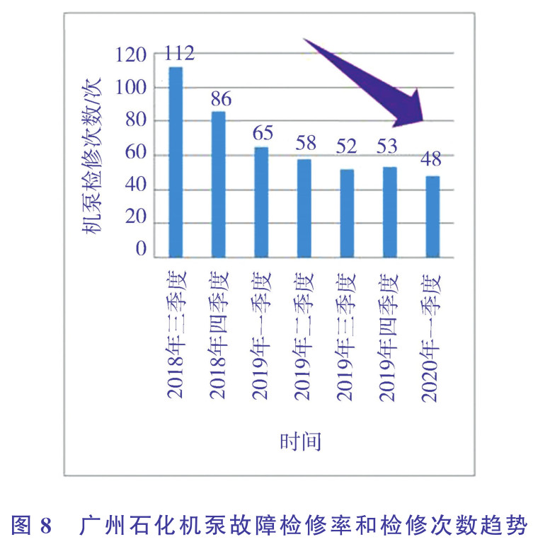 廣州石化利用泵群監測系統使機泵故障維修轉變為預知性維修,使預知性維修比例由15%提高到80%,機泵檢修次數逐漸減少,故障維修比例由60%下降至2.3%。其泵故障檢修率和檢修次數趨勢見圖8。