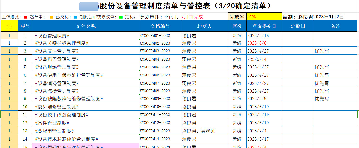 由“制度優化組”組長負責編制《設備管理制度增修管理表》(簡稱《建制管理表》),明確需修訂、新增、整合、刪除(內容重復)的文件名稱、編號,及編制分工、計劃完稿日。