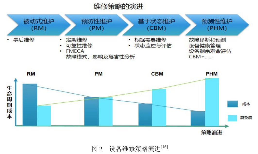 提質(zhì)、 降本、 增效、 節(jié)能降耗、 安全可靠和優(yōu)化性能是運(yùn)維策略和模式演進(jìn)的原動(dòng)力, 也是智能運(yùn)維主要目標(biāo)。 鋼鐵行業(yè)維修策略演進(jìn)路徑如圖 2 所示, 從被動(dòng)式維護(hù)(RM) 到預(yù)防性維護(hù)(PM), 再到基于狀態(tài)維護(hù)(CBM), 最后到預(yù)測性維護(hù)(PHM)。 其中被動(dòng)式維護(hù)是一種修復(fù)性維護(hù), 整體花費(fèi)最高。 預(yù)防性維護(hù)是應(yīng)對(duì)高可靠性系統(tǒng)場景, 可能造成系統(tǒng)過維護(hù), 進(jìn)而造成較多的浪費(fèi)。 基于狀態(tài)的維護(hù)(CBM) 可較準(zhǔn)確把握設(shè)備狀態(tài), 具有一定的針對(duì)性和精確性, 但也有一定局限性, 因?yàn)?CBM 只反映系統(tǒng)當(dāng)前情況,對(duì)設(shè)備未來狀態(tài)無法預(yù)知。 預(yù)測性維護(hù)(PHM) 不僅可以對(duì)當(dāng)前狀態(tài)進(jìn)行透視, 還能對(duì)設(shè)備未來狀態(tài)、 壽命和性能進(jìn)行預(yù)測, 進(jìn)而有效管理設(shè)備健康狀態(tài)和可能出現(xiàn)的風(fēng)險(xiǎn), 從而大大降低系統(tǒng)運(yùn)維成本。