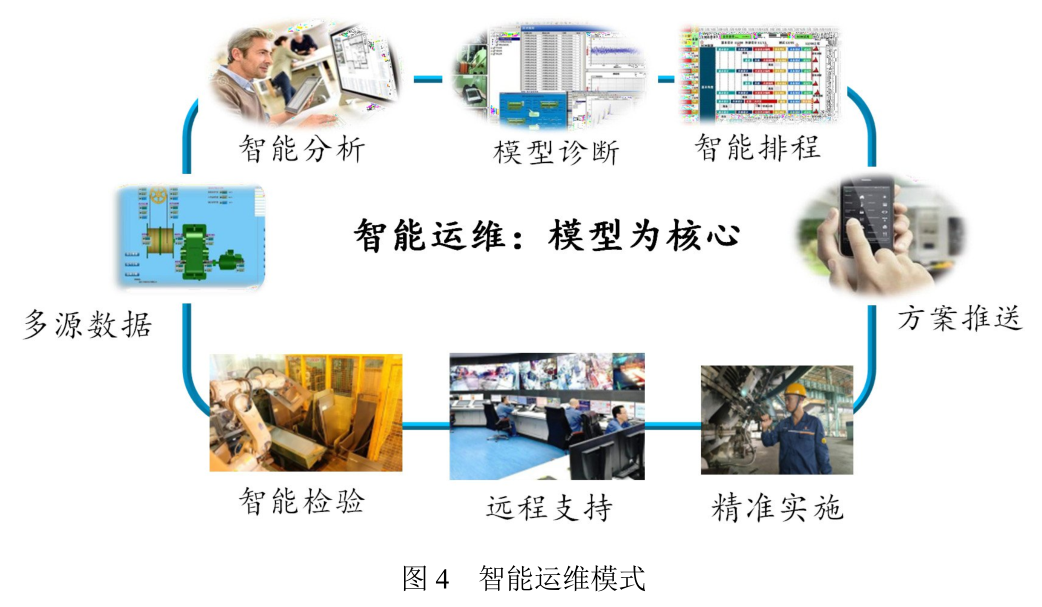 智能運(yùn)維流程如圖 4 所示, 通過物聯(lián)傳感部分替代五感點(diǎn)檢, 獲得產(chǎn)線和設(shè)備狀態(tài)參數(shù), 利用閾值或趨勢模型進(jìn)行智能分析和報(bào)警, 再采用機(jī)理模型或機(jī)器學(xué)習(xí)模型進(jìn)行智能診斷和智能預(yù)測, 基于大數(shù)據(jù)平臺(tái)和智能算法模型進(jìn)行運(yùn)維工作智能排程、 解決方案推送, 輔助運(yùn)維精準(zhǔn)實(shí)施, 根據(jù)需要運(yùn)維專家進(jìn)行遠(yuǎn)程支持,運(yùn)維結(jié)束后進(jìn)行智能檢查驗(yàn)證, 最后形成運(yùn)維流程閉環(huán), 實(shí)現(xiàn)運(yùn)維知識(shí)、 專家經(jīng)驗(yàn)、 設(shè)備機(jī)理和大數(shù)據(jù)知識(shí)的模型化, 并通過模型不斷迭代優(yōu)化, 從而提升模型的可靠性和準(zhǔn)確性。