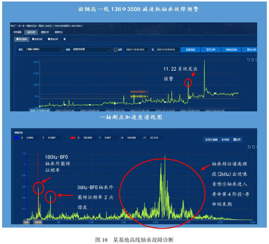 2020 年 11 月 22 日, 智能運(yùn)維大數(shù)據(jù)平臺(tái)持續(xù)報(bào)警高線 13HФ350H 減速機(jī)沖擊有效值 大, 如圖 10 所示, 結(jié)合系統(tǒng)與遠(yuǎn)程專家診斷, 專家判斷一軸沖擊有效值上升明顯, 軸承 180Hz 軸承外圈特征 BFO 頻率和2 次諧波數(shù)值增大, 同時(shí)在 2kHz 附近出現(xiàn)大量噪聲信號(hào), 確認(rèn)一軸軸承存在嚴(yán)重劣化, 立即申請線下維檢。經(jīng)現(xiàn)場運(yùn)維工程師檢查, 軸承出現(xiàn)保持架斷裂, 滾動(dòng)體磨損嚴(yán)重的故障, 經(jīng)及時(shí)更換軸承, 避免了一起嚴(yán)重的突發(fā)停機(jī)事故, 獲得良好評(píng)價(jià)。